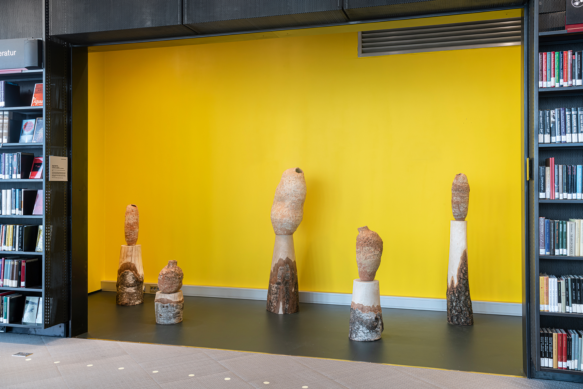 Is an installtion made for the main libary Deichman in Bjørvika, Oslo. It consists of five ceramic vessels in blue-clay placed on carved birch pedestals. Granite and slate is heavly present in three vessels. The largest sculpture is 160x45x40 cm and the smallest 57x25x25 cm.