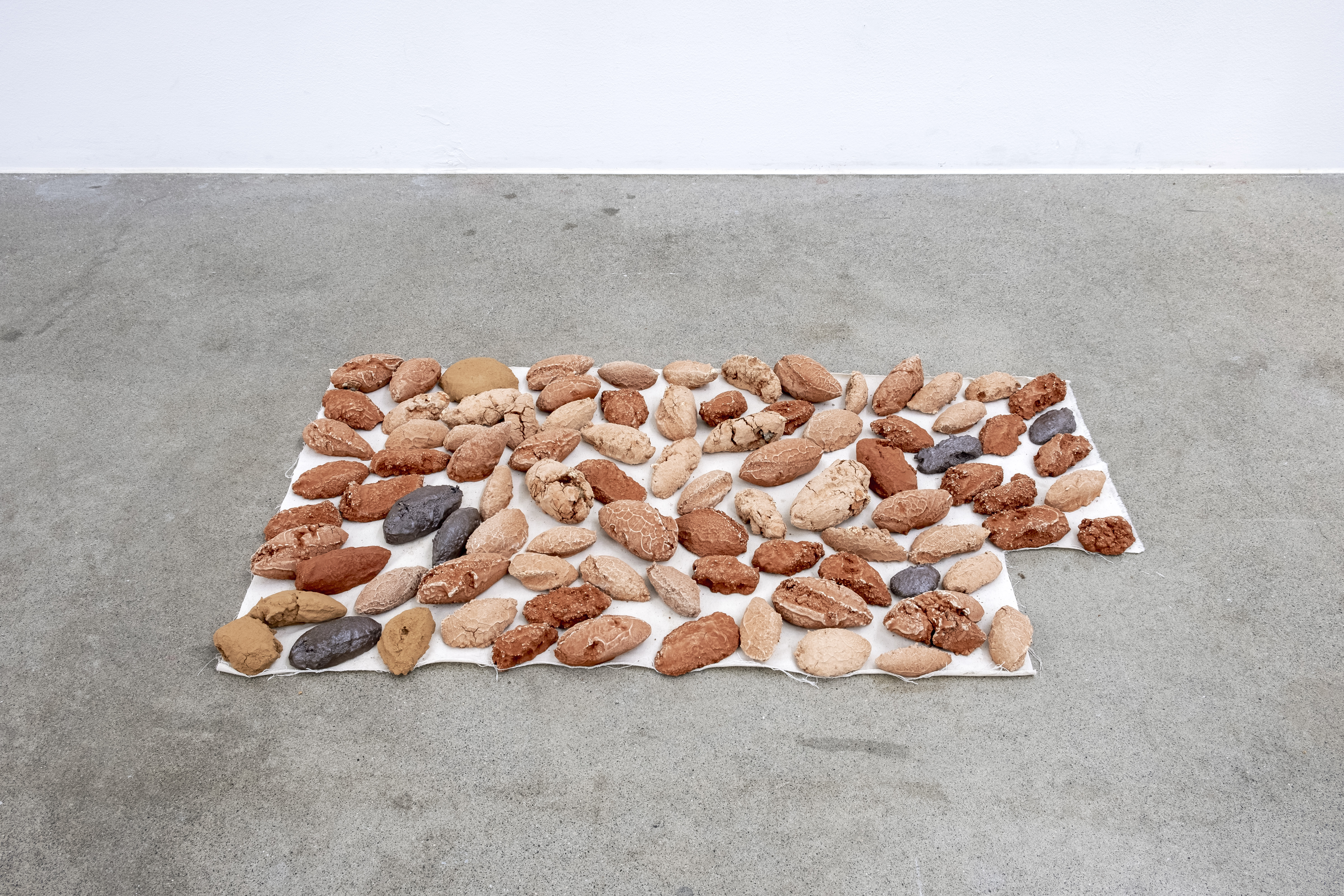 A solo exhibition with a series of sculptures, objects and a temporary floor work in raw and dried clay, low and high fired blue-clay. Shown in White Box gallery at Oslo National Academy of the Arts.